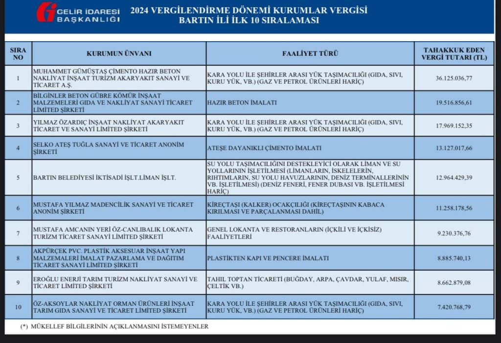 Gelir idaresi Başkanlığı (GİB) Türkiye’nin 81 iliyle birlikte Bartın Vergi Rekortmenlerini de açıkladı. 2024 Vergilendirme Dönemi Kurumlar Vergisi Bartın ilk 10 sıralamasın başında 36 milyon 125 bin lira ödediği vergiyle Muhammet Gümüştaş Çimento Hazır Beton Nakliyat geldi. Listenin ikinci sırasındaysa 19 milyon 516 bin lirayla Bilginler Beton gelirken üçüncü 17 milyon 969 bin lirayla Yılmaz Özardınç İnşaat yer aldı.