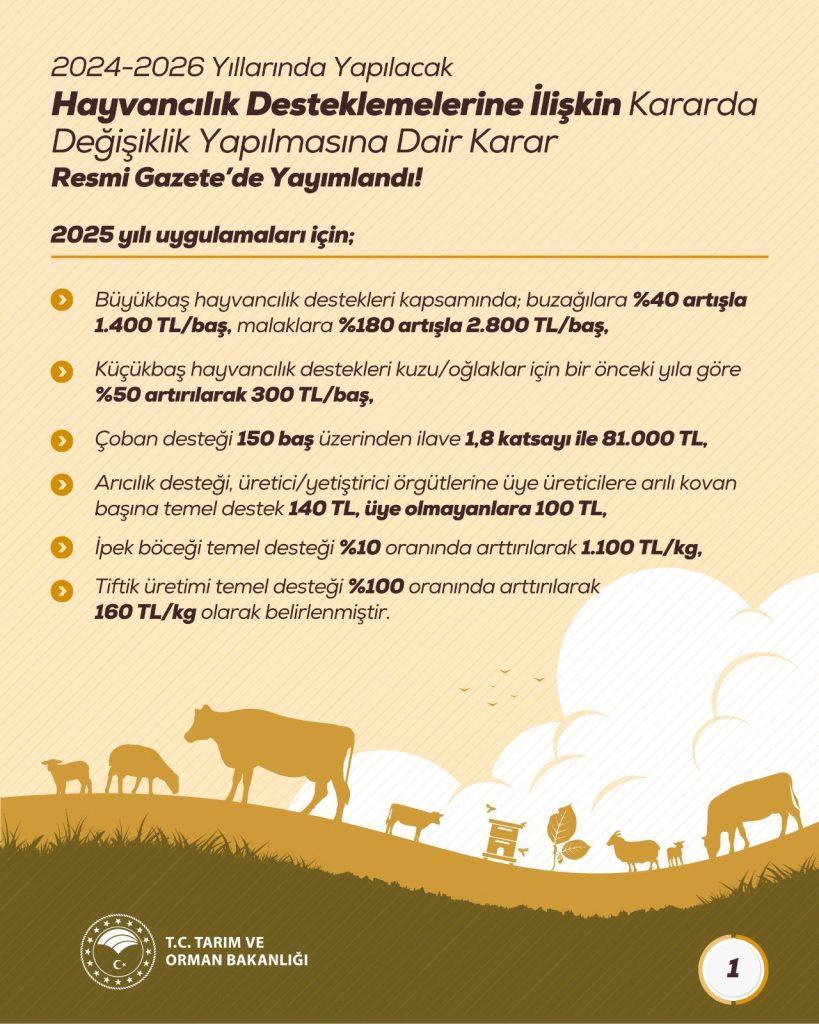 Bakanlık 2024-2026 Yıllarında Yapılacak Hayvancılık Desteklemelerine İlişkin karar D-değişiklikleri Resmi Gazete’de yayımlanarak yürürlüğe girdiğini açıkladı. Bartın’da hayvancılıkla uğraşan çiftçiler dahil herkese kararın hayırlı olmasını dileyen Bakanlık, “Üreticimizin yanında olan, sektörümüzü güçlendiren düzenlemeler hayırlı olsun.” dedi.
