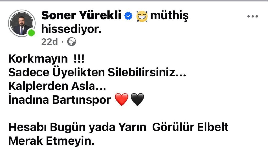 Üyeliğinin silinmesine “Korkmayın! Sadece üyelikten silebilirsiniz. Kalplerden asla. İnadına Bartınspor.” sözleriyle tepki gösteren Yürekli’nin paylaşımındaki son cümlesiyse tehditvari olarak algılandı.