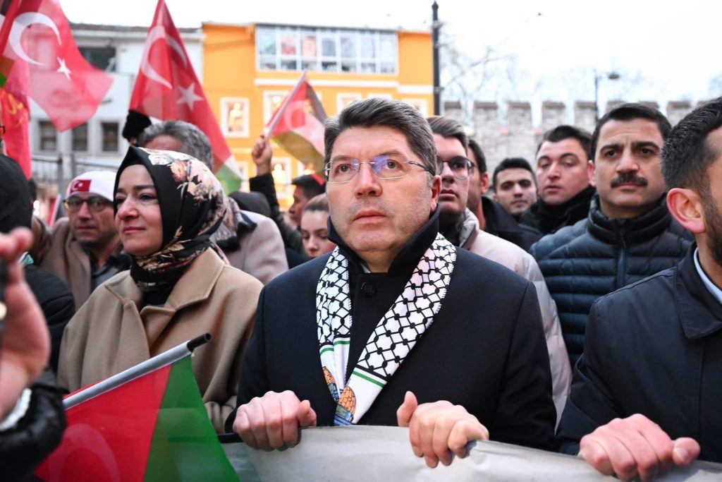 TÜGVA tarafından düzenlenen yürüyüşte yürekleri Filistin için atan on binlerce insanla birlikte Galata Köprüsünde buluşan Bakan Tunç, “Sinmiyoruz, susmuyoruz, Filistin’i unutmuyoruz.” dedi.