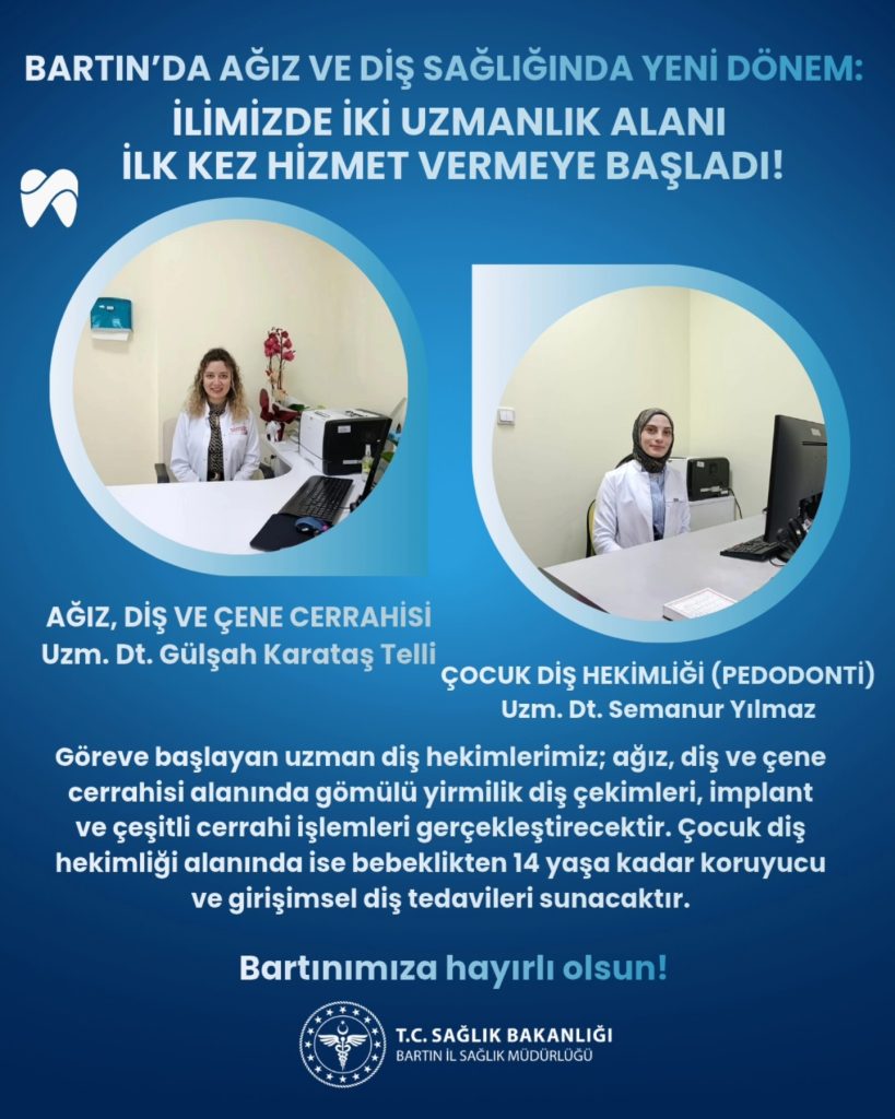 Her iki diş hekimi de hastanede hizmete başlarken Bartın Sağlık İl Müdürlüğü, “Yeni uzmanlık alanlarının hizmete girmesiyle birlikte; ileri cerrahi işlemler ile çocuklara yönelik koruyucu ve tedavi edici ağız ve diş sağlığı hizmetlerinin ilimizde daha kapsamlı, erişilebilir ve etkin şekilde sunulması hedeflenmektedir. Göreve başlayan uzman hekimlerimize başarılar diliyor, yeni hizmetlerin ilimize hayırlı olmasını temenni ediyoruz.” dedi.