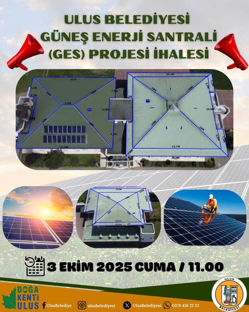 Bartın Ulus Belediyesinden yenilebilir enerji hamlesi geldi. İlçeye Belediyenin girişimleriyle 205 kw gücündeki Güneş Enerjisi Santrali (GES) kurulacak. Ulus Doğa Park Otel çatısına yapılacak santralin ihalesi 3 Ekim Cuma günü 11.00’da gerçekleştirilecek.