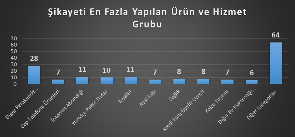 Ağustos ayında yapılan başvurularda, tüketicilerin en fazla şikâyette bulunduğu ürün ve hizmet grubu, 28 adet başvuru ile Diğer Perakende Ticaret Ürünleri oldu. Bu kategoriyi 11’er başvuru ile Kıyafet ve İnternet Aboneliği, 10 başvuru ile Yurtdışı Paket Turlar, 8’er başvuru ile Sağlık ve Kredi Kartı Üyelik Ücretleri, 7’şer başvuru ile Yolcu Taşıma, Ayakkabı ve Cep Telefonu, 6 başvuru ile Diğer Ev Elektroniği Ürünleri izledi. Diğer çeşitli kategorilerden de toplamda 64 başvuru yapıldı.