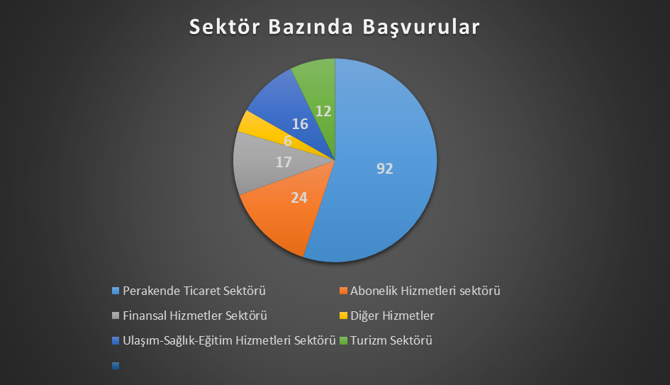 Sektörel bazda incelendiğinde en çok başvuru 92 adet ile Perakende Ticaret Sektöründe gerçekleşti. Bunu sırasıyla 24 başvuru ile Abonelik Hizmetleri, 17 başvuru ile Finansal Hizmetler, 16 başvuru ile Ulaşım, Sağlık ve Eğitim Hizmetleri, 12 başvuru ile Turizm Hizmetleri 6 başvuru ile Diğer Hizmetler Sektörü takip etti.