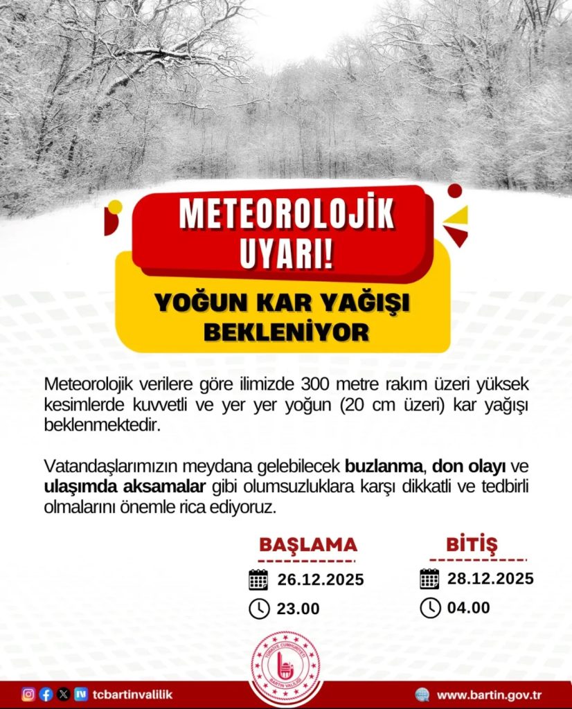 Bartın Valiliği, kent genelinde beklenen yoğun kar yağışı nedeniyle vatandaşları uyardı.