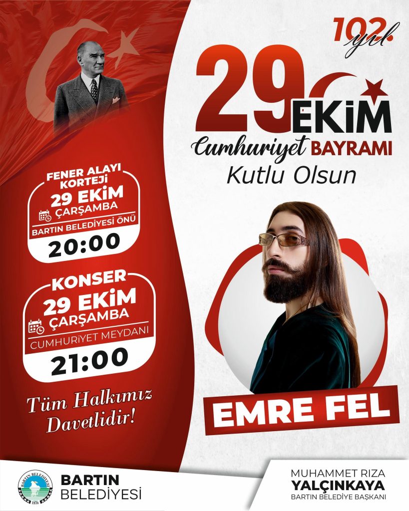 Bartın Belediyesi, Cumhuriyetin 102. yılını büyük bir coşkuyla kutlamaya hazırlanıyor. 29 Ekim Cumhuriyet Bayramı etkinlikleri kapsamında ünlü sanatçı Emre Fel, Bartın’da konser verecek.