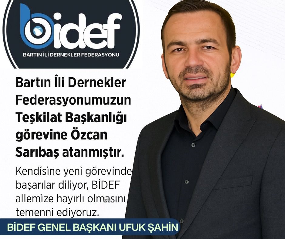 Bartın İli Dernekler Federasyonunda (BİDEF) yeni atamalar gerçekleşti. Federasyon Genel Sekreterliğine Hasan Kayserili getirilirken Teşkilat Başkanı Özcan Sarıbaş oldu. Federasyon Başkanı Ufuk Şahin hem Sarıbaş’a hem de Kayserili’ye “Kendilerine yeni görevinde başarılar diler, BİDEF ailemize hayırlı olmasını dileriz” sözleriyle bundan sonraki çalışmalarında başarılar diledi.
