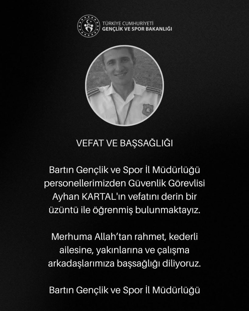Bartın Gençlik ve Spor İl Müdürlüğü personellerinden Güvenlik Görevlisi Ayhan Kartal hayatını kaybetti.