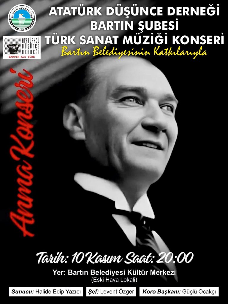 Atatürkçü Düşünce Derneği tarafından, Bartın Belediyesi’nin katkılarıyla 10 Kasım Pazartesi günü Bartın Belediyesi Kültür Merkezi’nde Türk Sanat Müziği konseri verilecek.