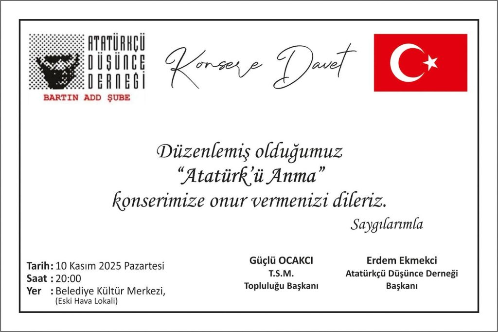 Atatürk’ü anma konseri düzenleyeceklerini belirten ADD Bartın Şube Başkanı Erdem Ekmekçi, “Bartın Belediyesi’nin katkılarıyla Atamızı anma konseri gerçekleştireceğiz. Bartın Belediyesi Kültür Merkezi’nde Türk Sanat Müziği konserine tüm vatandaşlarımızı bekliyoruz” dedi.