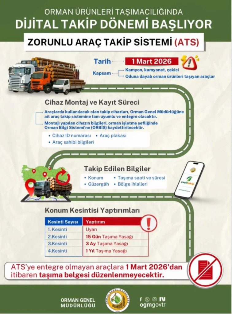 Cihaz montair ve kaytt islemleri, Orman Gene Müdürlüğümüze ait sistemlerle tam uyumlu sekilde yapılacak ve bilgiler ORBİS üzerinden kayıt altına alınacaktır. ATS’ye entegre olmayan araçlara 1 Mart 2026’dar itibaren tasıma belgesi düzenlenmeyecektir. Kurallara uyalım, ormanlarımızı birlikte koruyalım.”