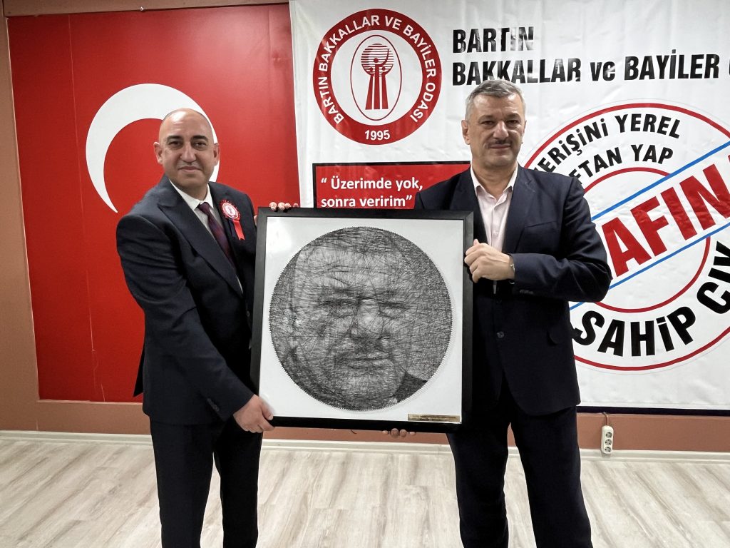 Bartın’da 5 yıldır görev yapan Eski Ticaret İl Müdürü Erhan Özcan’da Bartın’dan ayrılmadan önce Bakkallar ve Bayiler Odasını bu önemli günde yalnız bırakmadı. Bartın’daki görev süresince kendilerine ve esnafa verdiği destekler için teşekkür eden Barış Özkan, Özcan’a telkâriden yapılan portre tablosunu hediye etti.