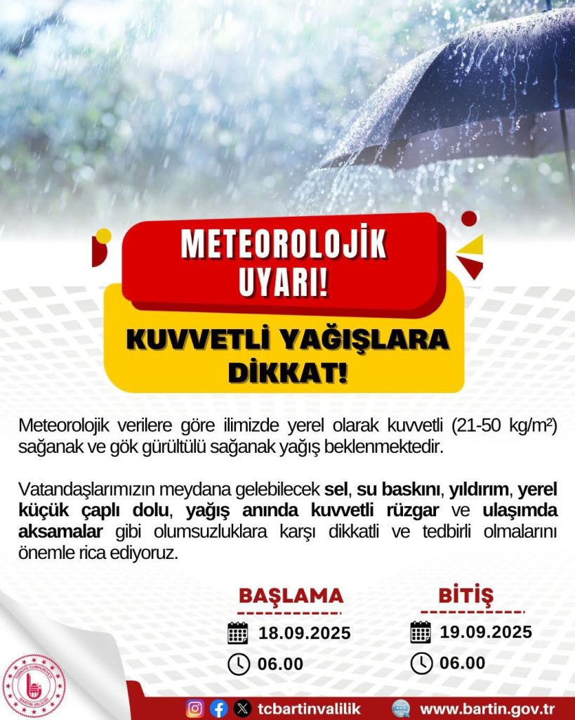 Meteorolojik verilere göre 18 Eylül 2025 tarihinde Bartın’da yerel olarak kuvvetli (21-50 kg/m²) sağanak ve gök gürültülü sağanak yağış bekleniyor.