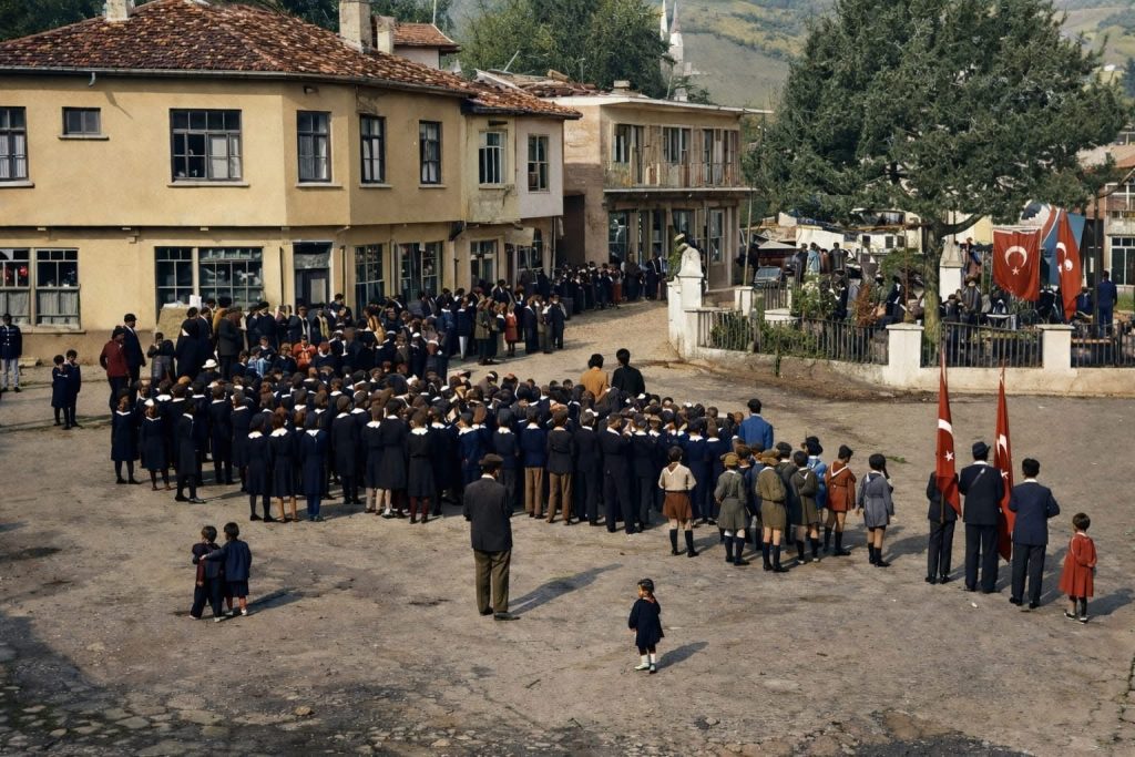 23 Nisan Ulusal Egemenlik ve Çocuk Bayramı kutlamaları esnasında çekildiği anlaşılan fotoğrafta meydanı Türk Bayrakları süslüyor. Fotoğrafta öğrencilerin giydiği siyah önlük dönemi yansıtırken aynı zamanda bir grup çocuk izci kıyafetleriyle görülüyor.