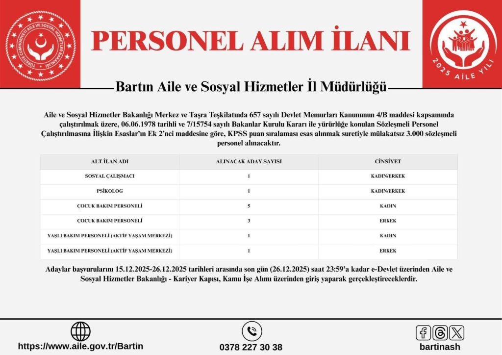 Bartın Aile ve Sosyal Hizmetler İl Müdürlüğü, 1 sosyal çalışmacı, 1 psikolog, 5 çocuk bakım personeli, 3 çocuk personeli, ve 2 yaşlı bakım personeli olmak üzere toplam 12 kişi alacak. Ülke genelinde toplam 3 bin personel arasında yapılacak alımlar, KPSS puan sıralaması esas alınarak mülakatsız yapılacak.