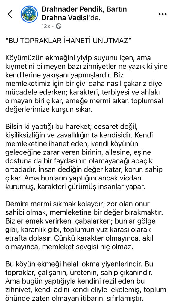 Bu köyün ekmeği helal lokma yiyenlerindir. Bu topraklar, çalışanın, üretenin, sahip çıkanındır. Ama bugün yaptığıyla kendini rezil eden bu zihniyet, kendi adını kendi eliyle lekelemiş, toplum önünde zaten olmayan itibarını sıfırlamıştır.