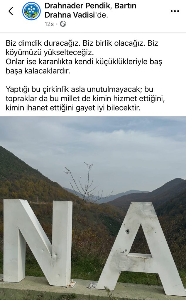 Bartın Ulus İlçesinde bulunan Drahna bölgesine yaptırılan “Drahna” yazısı, kimliği bilinmeyen kişilerce kurşun sıkıldı. Yazının adeta atış talimi gibi kullanılmasına “Bu topraklar ihaneti unutmaz.” diyen DRAHNADER’den sert sözlerle tepki geldi.