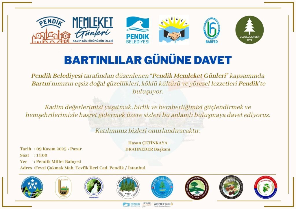 “Bartınlılar Pendik’te buluşuyor” diyen Başkan Çetinkaya, “Pendik Belediyesi’nin düzenlediği Pendik Memleket Günleri kapsamında, Bartın’ın doğal güzellikleri, kültürü ve yöresel lezzetleri Pendik’te buluşuyor. Hep birlikte kadim kültürümüzü yaşatmak ve hemşehrilerimizle hasret gidermek için sizleri de bu anlamlı etkinliğe bekliyoruz.” dedi.